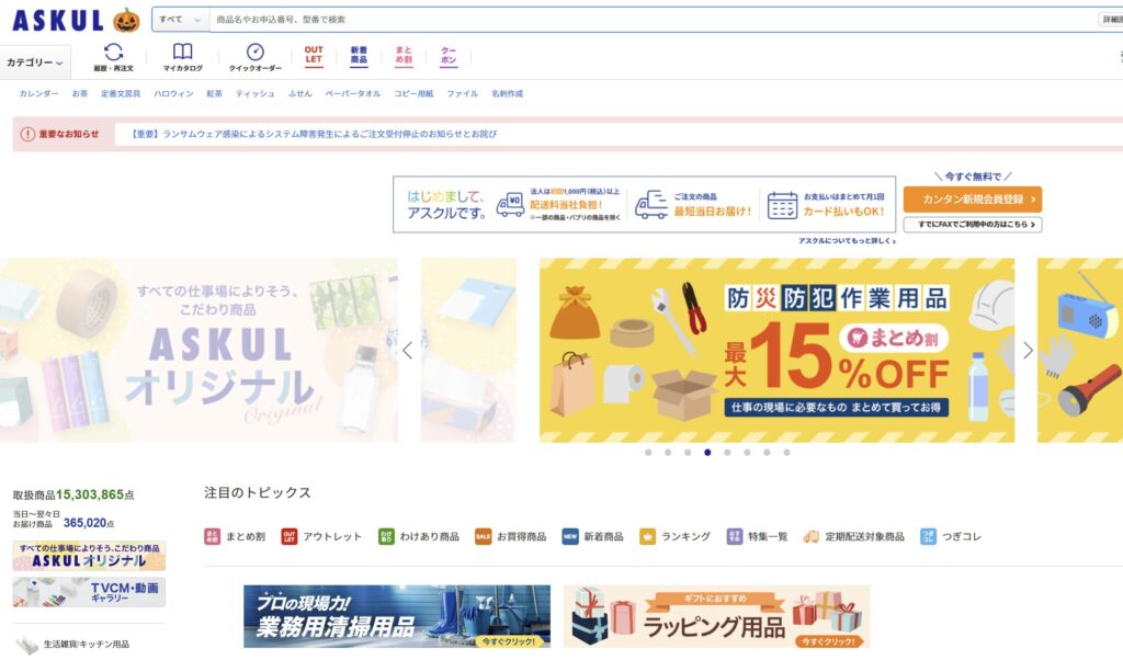 データを暗号化し、復元するために身代金を要求するランサムウェアの感染により、アスクルのECサイトでシステム障害が発生。現在、「ASKUL」「ソロエルアリーナ」「LOHACO」の各サイトの受注・出荷業務を停止しています。
