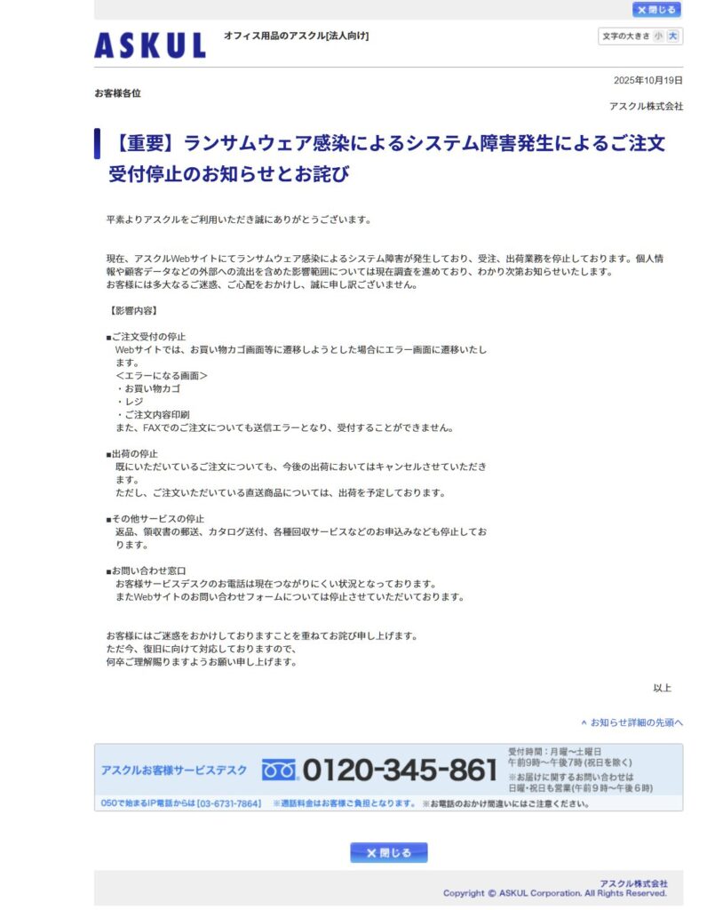 アスクルは10月19日、ランサムウェア感染によるシステム障害が発生したと発表した。この影響で、ECサイトの「ASKUL」や「LOHACO」などの受注・出荷業務を停止。良品計画の「無印良品」もサービス・機能を停止している。再開のメドは立っていない。ランサムウェア感染の発表しました。